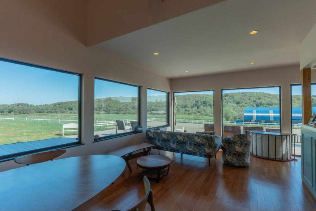 青い大きなD型ハウスの奥にはおしゃれで開放的な空間が魅力的なカフェ棟が。そのカフェからは広大な牧場の敷地とそのなかでのんびりと自由に走る、牧草を食べる馬たちを眺めることができます。