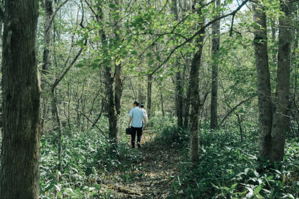 最初はひたすら森の中の一本道を進んでいきます。今回は馬たちと一緒に歩くことができませんでしたが、本来であればこの道を”どさんこ”とともに歩いていく。まるで、どさんこが活躍していた開拓当時の世界に迷い込んだ気持ちになります。木材をどさんこと人が一体となって運んでいた風景はまさにこのような世界だったのかもしれません。